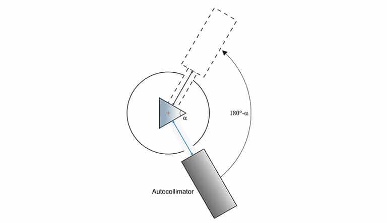 The refractive index can be determined only when the apex angle α is precisely known. Both angles α and δ are measured with an ultra-precision goniometer with sub-arcsecond accuracy. The apex angle α is measured with an autocollimator attached to the goniometer table.
